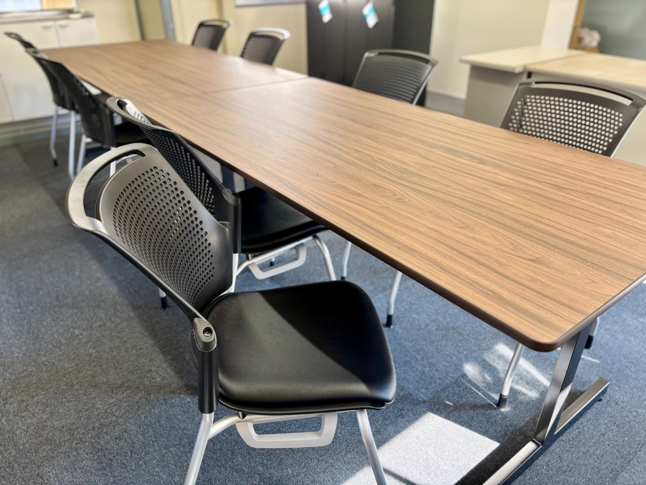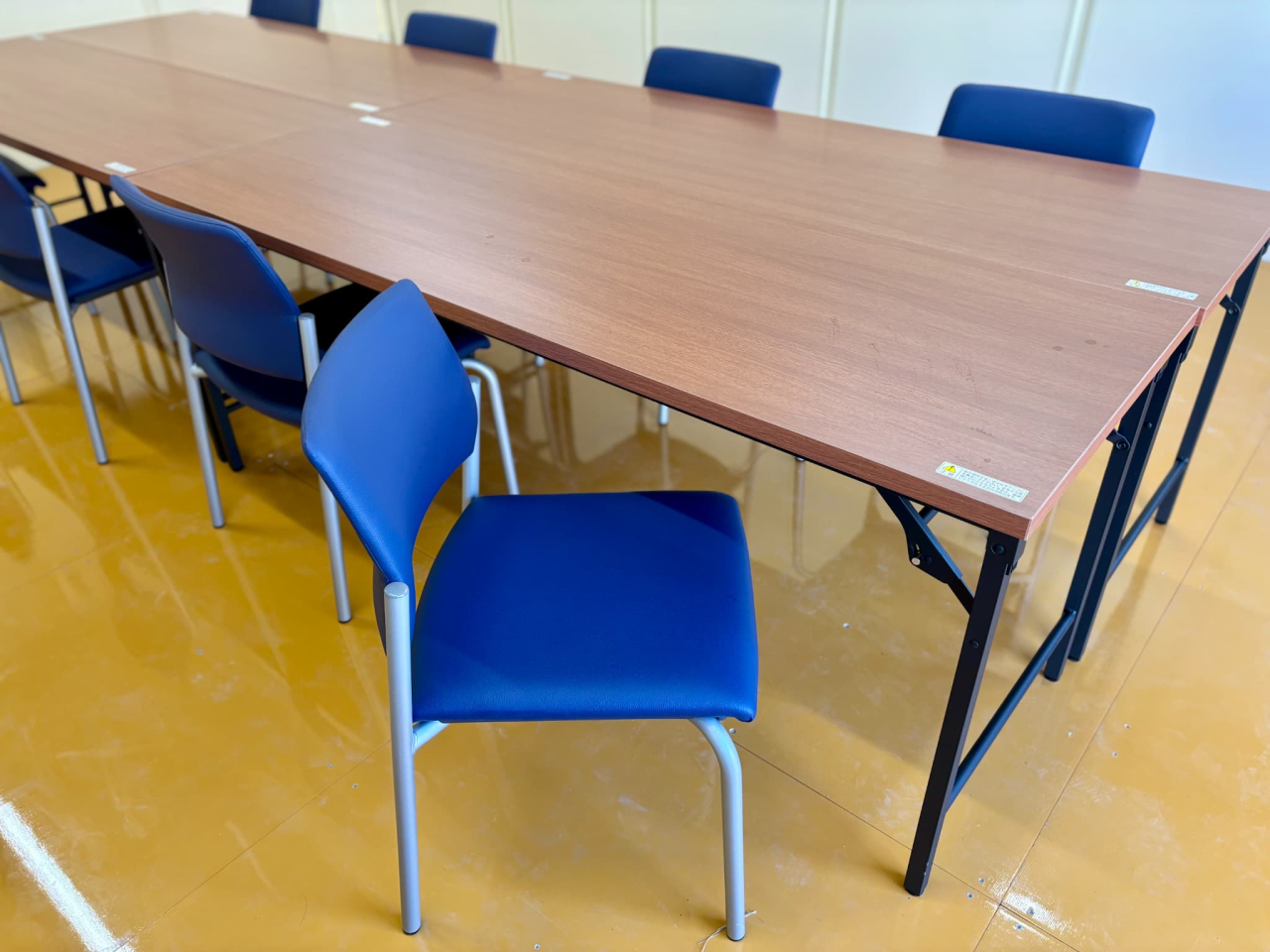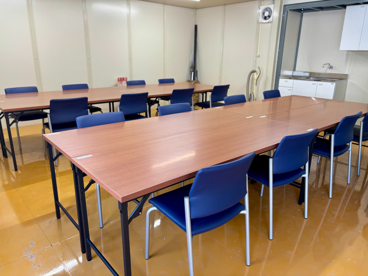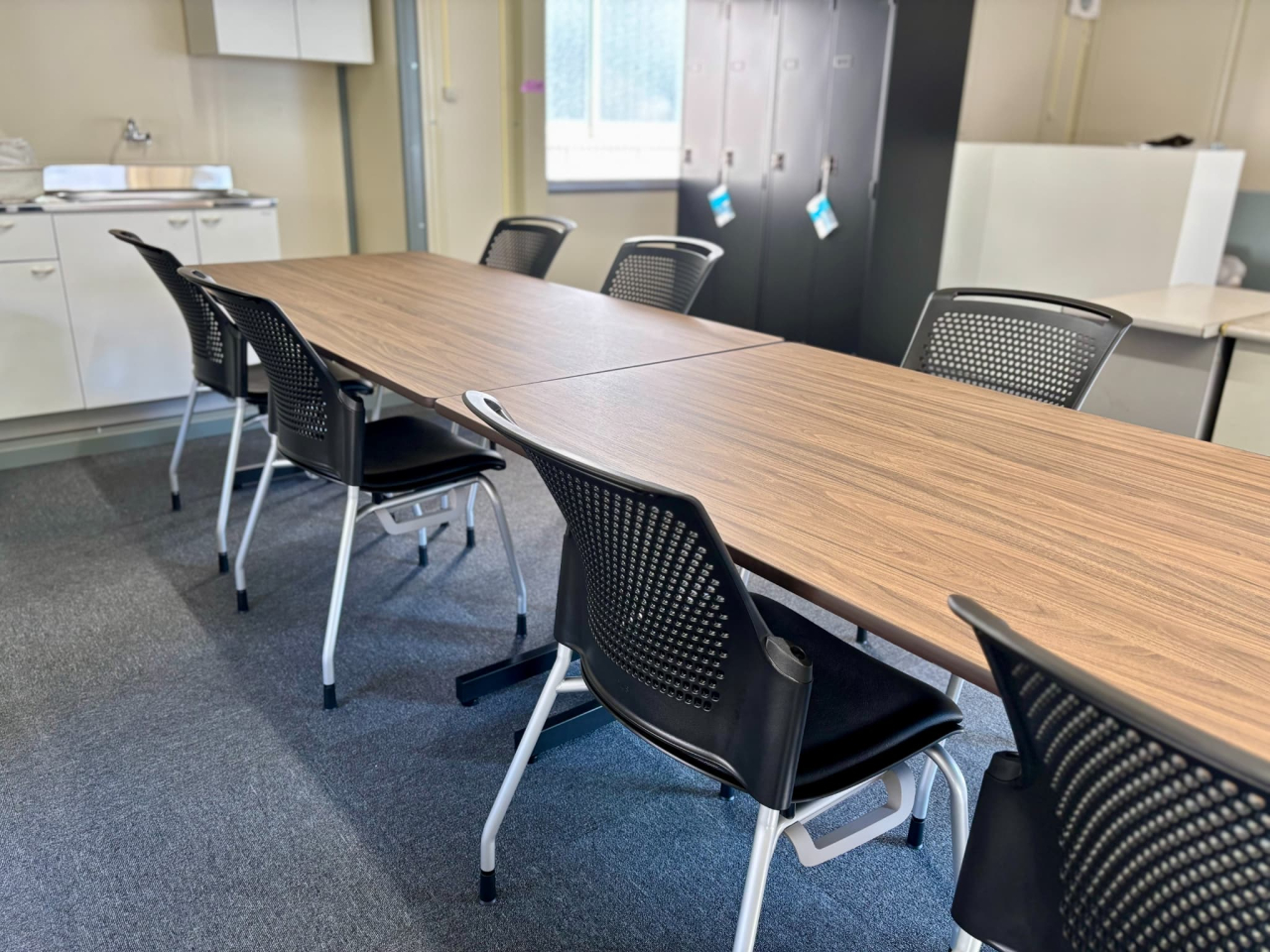 | 施工内容 | ▶事務所 事務所移転に合わせて、来客スペースに新しい家具を設置しました。落ち着いた濃い木目調のテーブルを採用し、チェアはブラックカラーで統一しました。ビニルレザーは汚れが目立ちにくく、日常のお手入れも簡単で、水拭きで清潔さを保てます。耐久性にも優れているため、長期的な使用にも安心です。 ▶食堂 社員がリフレッシュできる休憩室には、広々としたテーブルと座り心地の良いチェアを導入しました。こちらもビニルレザー素材を採用し、現場で働く方々が気軽に利用できるよう配慮しています。テーブルは複数人での食事や打ち合わせに対応できるサイズを選びました。チェアはブルーを基調としたデザインで、耐久性とメンテナンス性を兼ね備えた仕様です。長時間の使用にも快適さを維持します。 |